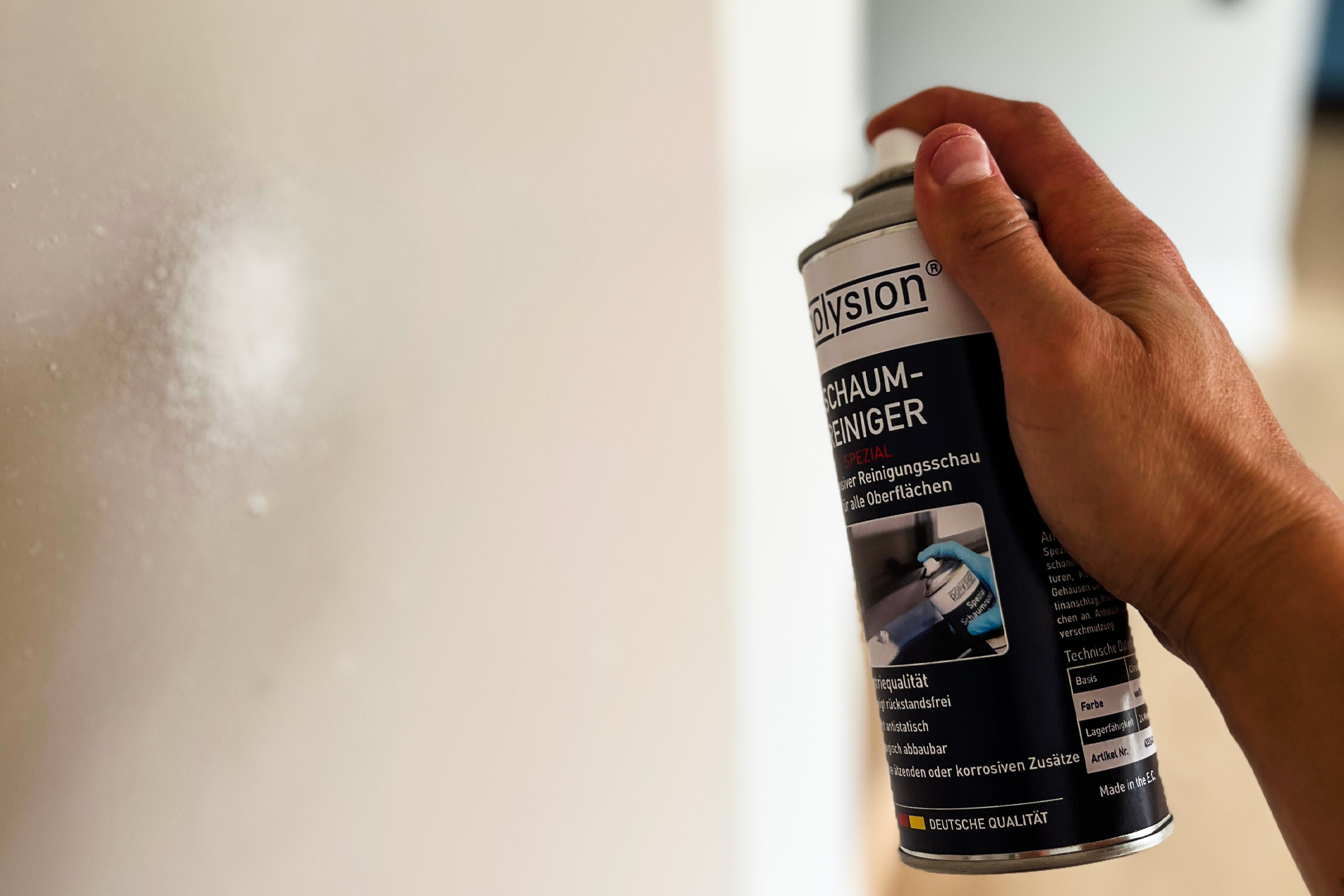 Schaum aus ca. 25 cm Entfernung direkt auf die verschmutzte Fläche sprühen